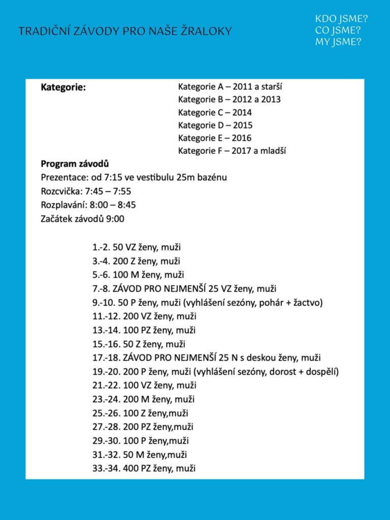 Čeká nás tradiční plavecký přebor určený pro zkušenější plavce z plavecké přípravky a závodníky, kteří jsou již připraveni na soutěžní atmosféru.